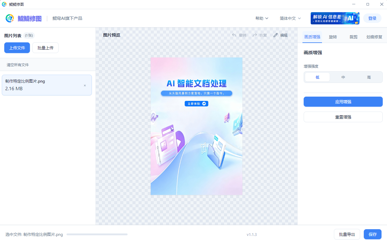 鲲鲲修图是一款集成了核心 AI 技术的批量图片处理工具,它将专业级的修复能力与极简操作相结合,彻底打破了 “修图必须专业” 的门槛。无论是修复岁月侵蚀的老照片,还是优化截图、扫描件的清晰度,它都能一键搞定。其核心功能包括画质增强、旋转、裁剪、划痕修复等,每一项都精准命中用户痛点。